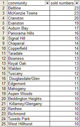 其实,仔细一看,大部分成交量活跃的都是新区,当然啦,人家开发商有大把的房源放到市场上。小的从普通公寓起,到大户人家的前置三车库豪宅。另外一个方向是infill老城区,像Killarney,Tuxedo, West Hillhurst。而老社区,因为当年占地大,居民户相对少,很难挤进这些前茅名单。