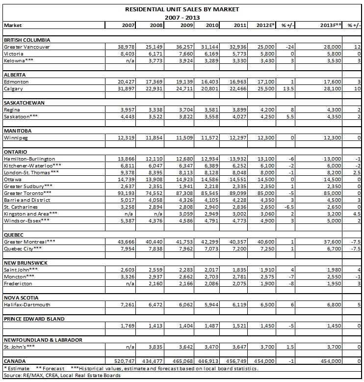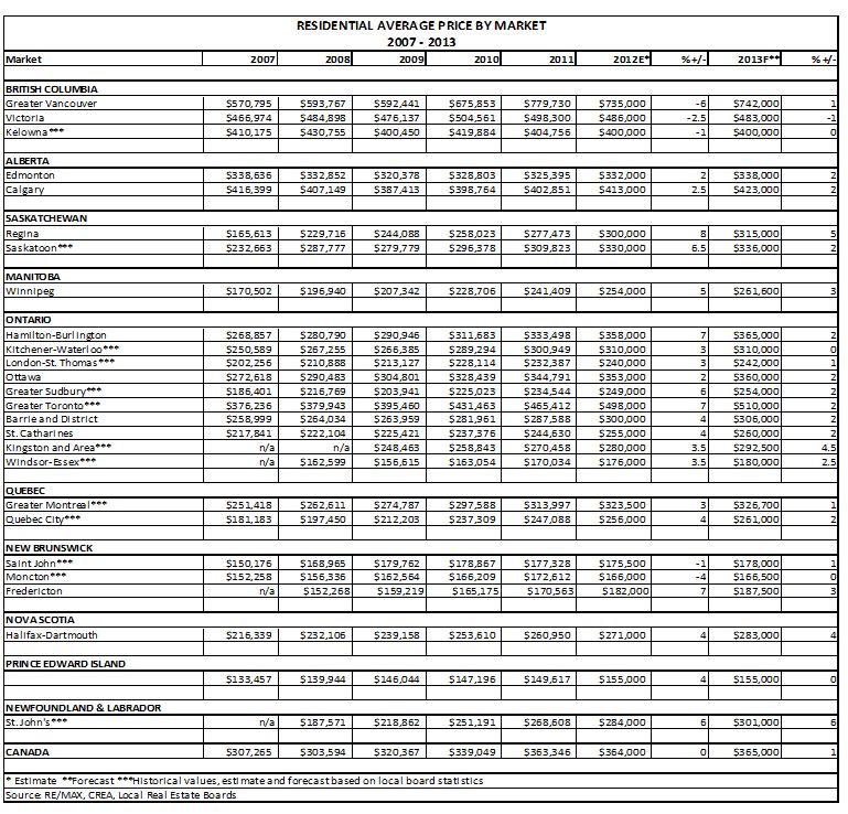 The RE/MAX Housing Market Outlook 2013 examined trends and developments in 26 major markets across the country. The report found that the number of homes sold is expected to match or exceed 2011 levels in 65 per cent of markets (17/26) in 2012, led by strong activity in Western Canada, including Calgary (up 13.5 per cent) and Regina (eight per cent). Eighty-one per cent (21/26) of markets are set to experience average price increases by year-end 2012, with Regina the country’s frontrunner at eight per cent, followed by Hamilton-Burlington, Greater Toronto, and Fredericton at seven per cent and Saskatoon at 6.5 per cent. The forecast for 2013 shows the upward trend moderating, but values still ahead of 2012 levels in 85 per cent (22/26) of centres. Stability is forecast to characterize Canadian real estate in the new year, with sales above or on par with 2012 levels in 81 per cent (21/26) of markets.