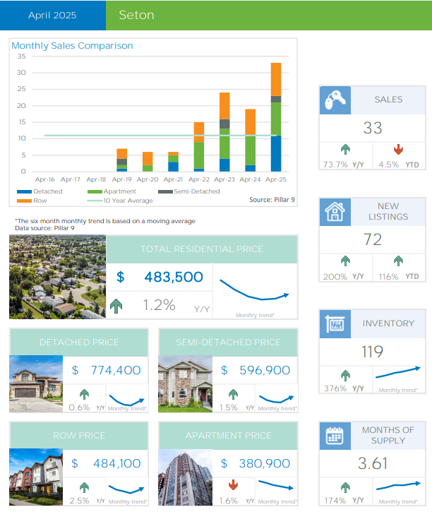 Detached remains the premium segment. Price softening reflects higher inventory (6.4 months of supply), but demand persists for newer 2020-built two-storey homes averaging 1,786 sq ft