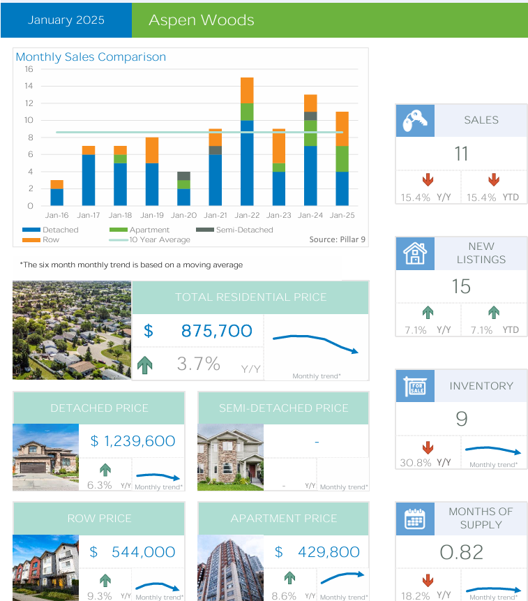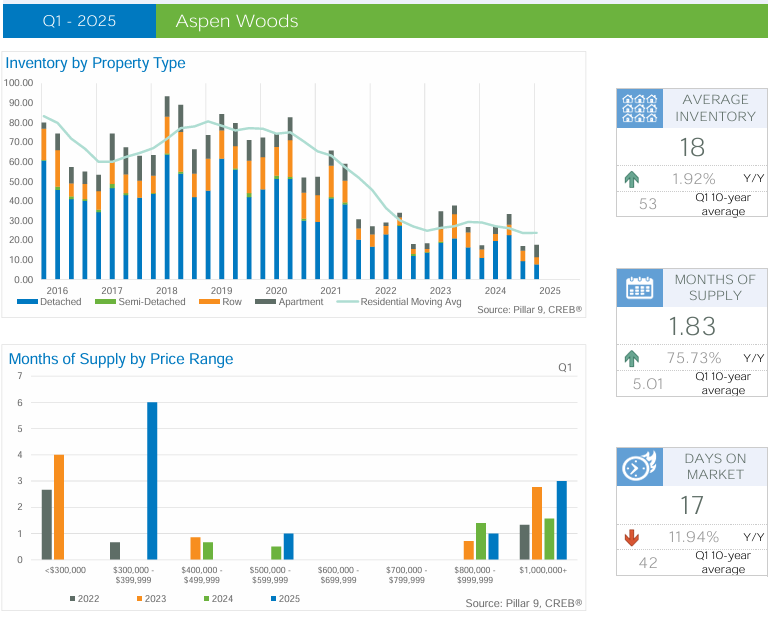 Semi-Detached Homes: Specific data for semi-detached homes in Q1 2025 is limited. However, the broader Calgary market saw semi-detached benchmark prices at $673,600 in February 2025, reflecting an 8.3% annual increase. This suggests a positive trend that may extend to Aspen Woods.