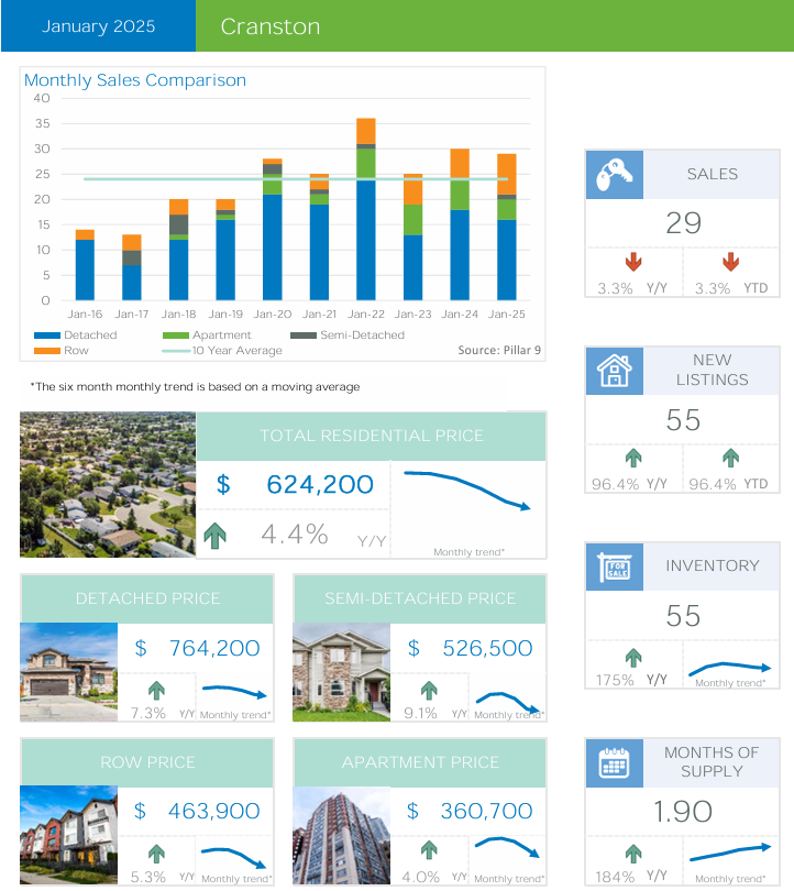 Cranston is showing signs of healthy growth across all property types. Detached homes, while commanding higher prices, continue to perform steadily, while the semi-detached and row segments are rising stars, particularly for first-time and move-up buyers. The apartment market is comparatively slower, but stable.